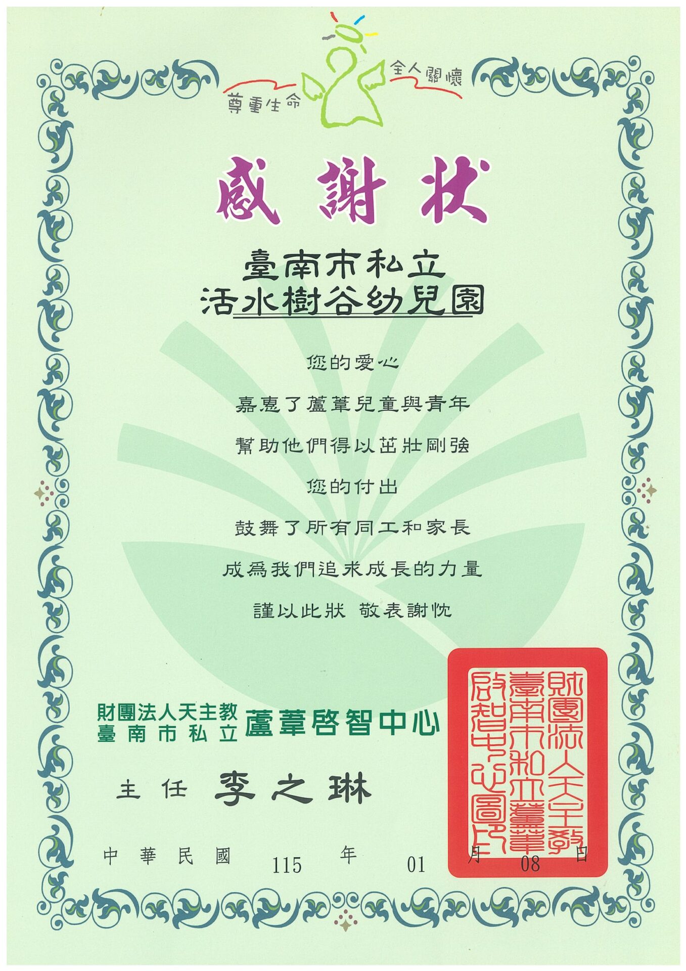 圖|蘆葦啟智中心致贈本園之感謝狀